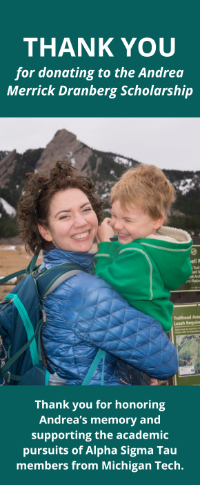 Andrea Merrick Dranberg was initiated as a member of the Beta Xi Chapter of Alpha Sigma Tau at Michigan Tech in 1998. While Andrea was fighting colon cancer, her Beta Xi Sisters took turns accompanying her to chemotherapy sessions. After Andrea passed away, her Sisters stayed in touch with and supported Andrea's husband and son. In 2023, Andrea's parents established this scholarship in her memory.